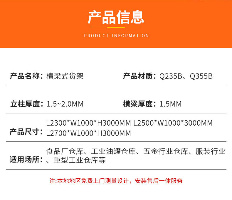 • 便捷高效:横梁式货架的货物出入库不受先后顺序的影响,便捷高效,广泛应用于以托盘货物集装存储、叉车机械存取的仓储模式