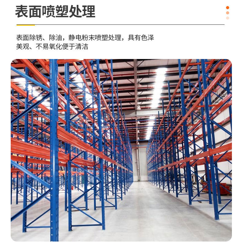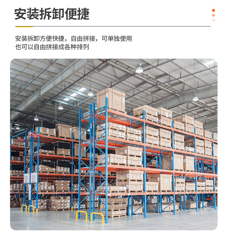 • 便捷高效:横梁式货架的货物出入库不受先后顺序的影响,便捷高效,广泛应用于以托盘货物集装存储、叉车机械存取的仓储模式